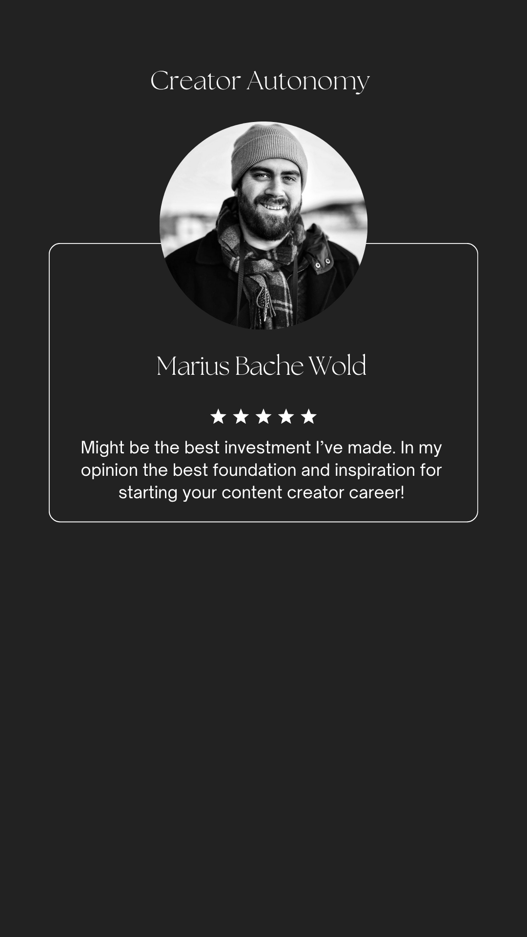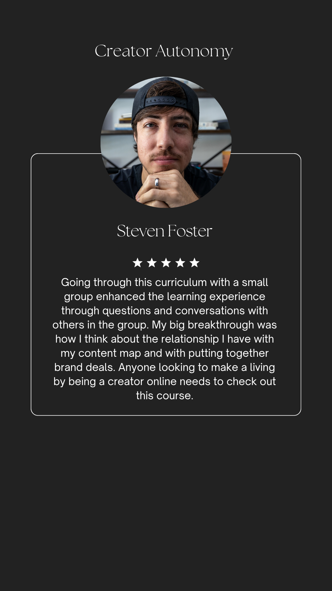 Creator Autonomy is a 4 week mastermind, that will unlock the framework for building a successful personal brand that will give you the freedom to create on your terms.